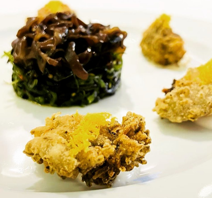 Ortiguillas del Cantábrico crocantes, tartar de algas y emulsión de lemongrass